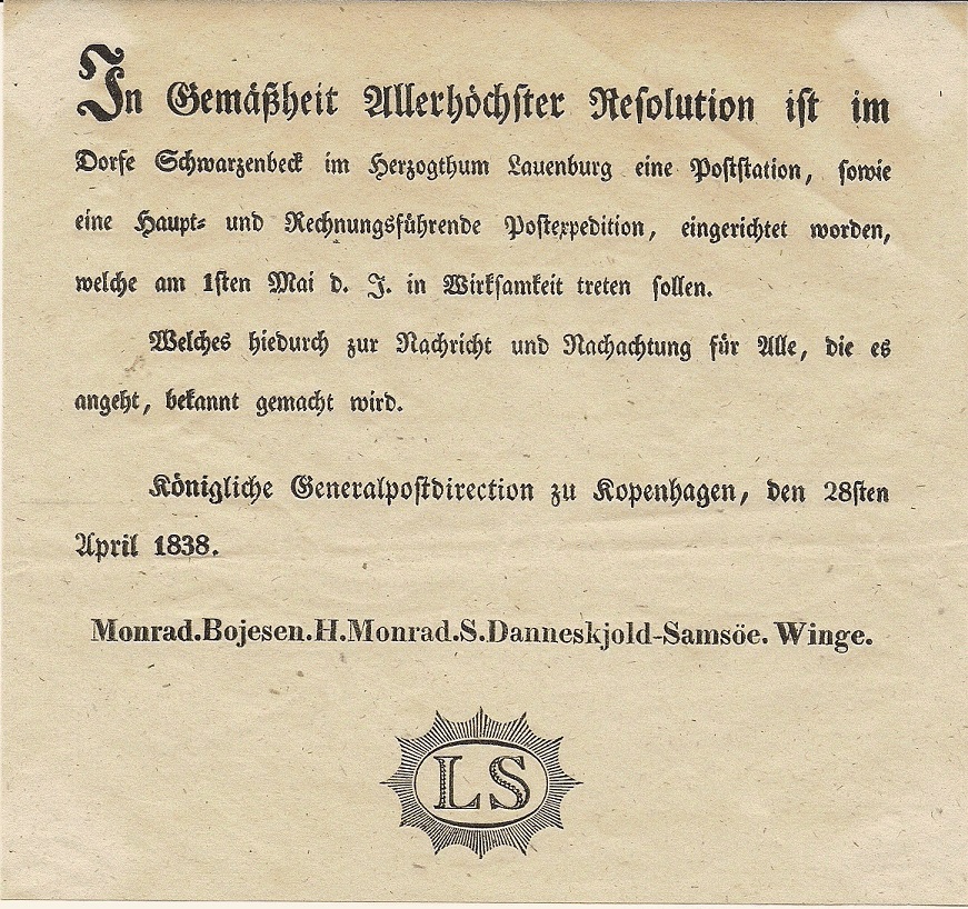 Zum Leiter der Postexpedition in Schwarzenbeck habe ich leider keine Informationen. Weder auf dem deutschsprachigen Plakat, das ich zeige konnte noch auf dem dänischsprachigen Plakat (in der online-Bibliothek der DPHS) ist der Leiter genannt. Auch bei Fogtman's rescripter (Verzeichnis aller königlichen Anordnungen) fehlt leider der Jahrgang 1838 in der online-Bibliothek.