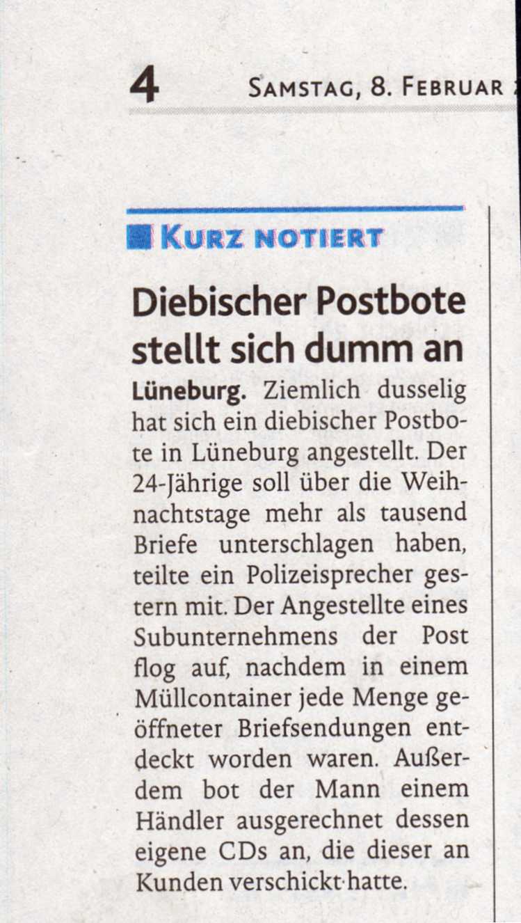 es ist doch nicht neu , daß bei der Post geklaut wird .Das gab es schon vor 10 Jahren . Es gab mal einen sehr schönen Bericht im FS , da wurde gezeigt wie man ungeniert in den Briefzentren klauen kann. Nachdem dieser Bericht gesendet wurde ging die Diebstahlrate zurück , weil das Personal ,daß gestohlen hatte ausgewechselt wurde . Soviel ich wei wurden auch einige sehr hohe Strafen verhängt.