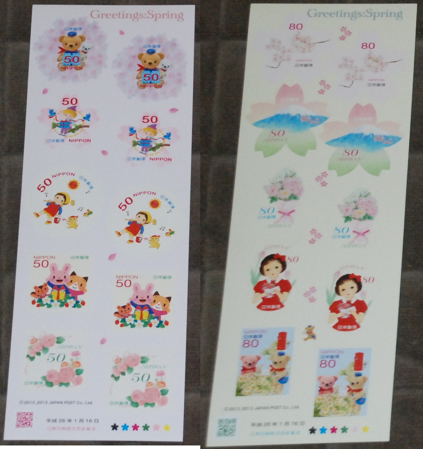 Japan 2013, Spring greetings, cats, roses, teddy bear, 20val adhes. in 2 sheetlets 22.50€