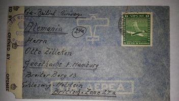 Der englische Zensurstempel (British Censorship Germany mit Krone) könnte vielleicht auch ein paar Euro mehr bringen, da wird die fehlende Ecke auch nicht so viel ausmachen (wurde ja wahrscheinlich von der Zensurstelle beschädigt und ist somit ein Zeichen, daß der Brief vor Ankunft von den Behörden geöffnet wurde!). Hier ein paar Beispiele bei Ebay, Sofortkauf-Preise können natürlich auch viel zu hoch gegriffen sein und deshalb auch keinen Käufer finden!):