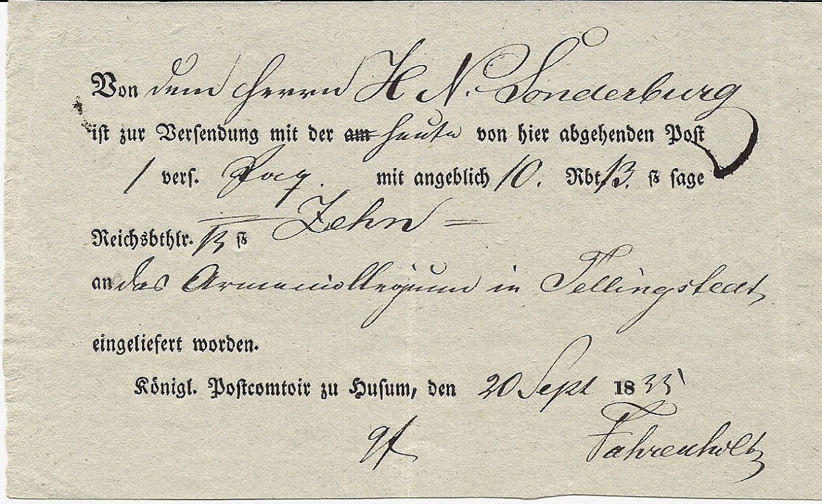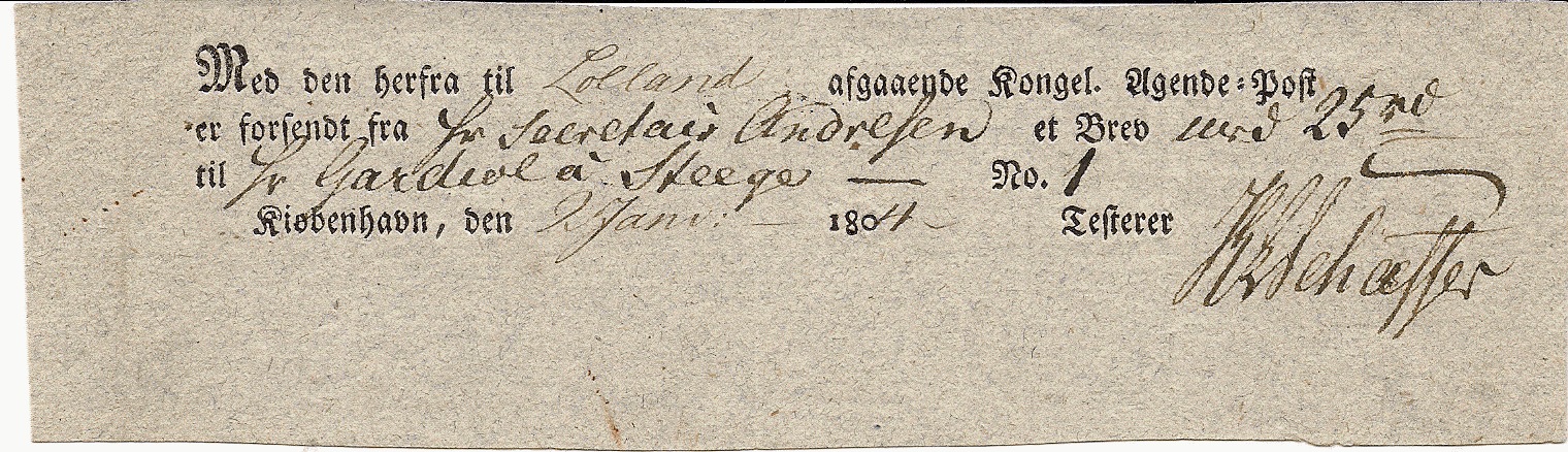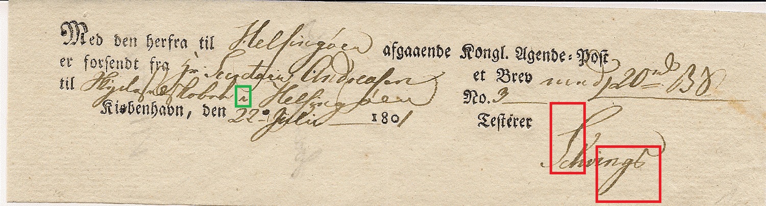 Diesmal ist es wohl ein Herr Postschreiber "Schwings". Und wie es auch in Dänemark üblich war, musste ein Postschreiber auch seinen eigenen Namen schreiben können. Nur, dass hier die Quelle irrt, oder der Postschreiber seinen Namen nicht schreiben konnte.