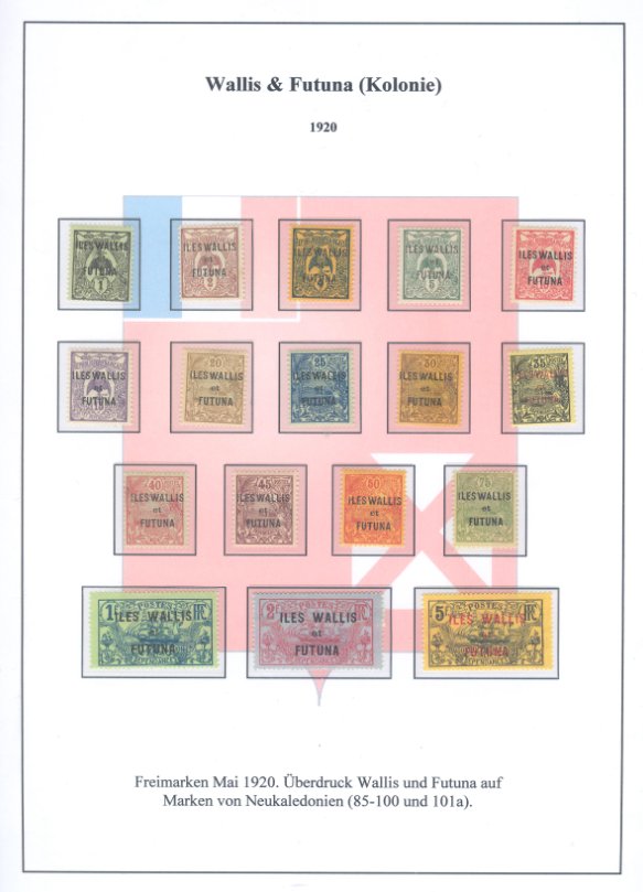 1. Die ersten zwei Seiten zeigen die ersten Marken von Wallis & Futuna (Überdrucke auf Marken von Neukaledonien). Zum Anfang sind die Einzelmarken zu sehen. Anschließend einige Bogeneinheiten zu den ersten Werten.