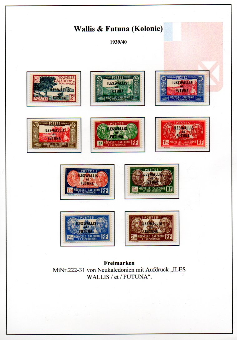 1. Freimarkenserie von 1939/40 (MiNr.87-96). Die Überdrucke sind auf Freimarken von Neukaledonien aufgebracht.