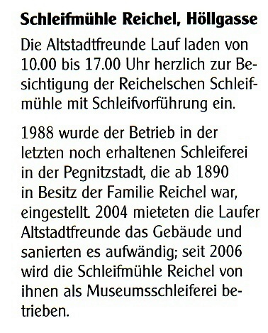 Am Samstag ist dann um 9.00 Uhr eine speziell für uns organisierte Führung und Besichtigung der Laufer "Schleif" durch unseren alten Altstadtfreundeführer Herrn Schober ( Messer mitbringen !!! ), anschließend freie Verfügung bis zum Treffen um 14.00 Uhr.