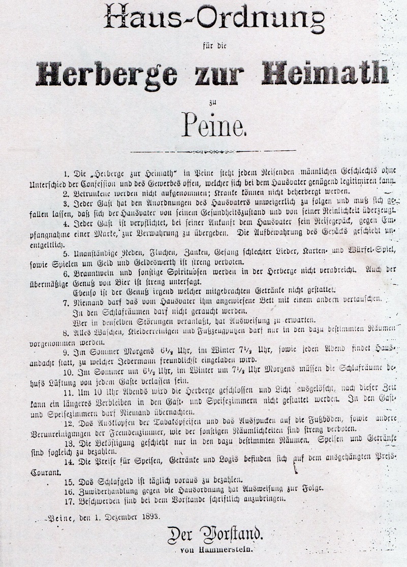 Es diente; wie der Name schon vermuten lässt als Herberge sprich Unterkunft für wandernde Handwerksgesellen und Arbeitssuchende. Unterhalten wurde das Haus von einem Trägerverein der sich aus Peiner Honoratioren - und Magistratsmitgliedern und zahlreichen Kaufleuten zusammensetzte.
