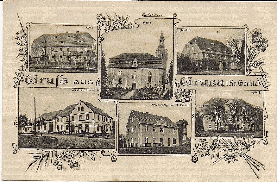 Gruna liegt heute in Polen und nennt sich seit 1945 Gronów. Ich habe sehr wenig zu diesem Ort gefunden. Ritters Ortslexikon von 1874 schreibt nur, dass Gruna im Regierungsbez. Liegnitz, Kreis Görlitz gelegen, 718 Einwohner hatte. 1933 hatte der Ort noch 580 Einwohner, 1939 nur noch 511 Einwohner. Das heutige Gronów hat nur noch 316 Einwohner. Obwohl an der Strasse von Görlitz nach Lauban gelegen offenbar ein Ort, der sich seit weit über hundert Jahren im Niedergang befindet.
