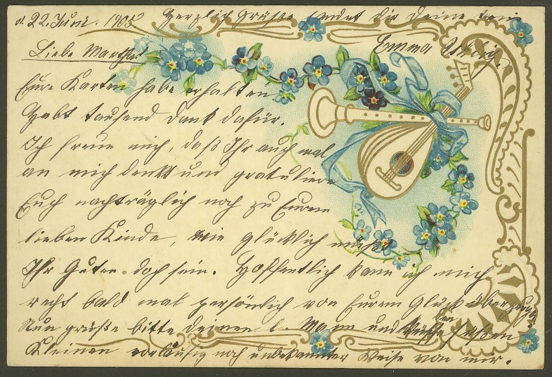 Anbieten kann ich diverse Karten aus Deutschland und Mitteleuropa, allerlei von Ägypten und kitschige deutsche Prägedruckkarten, gelaufen um 1910.