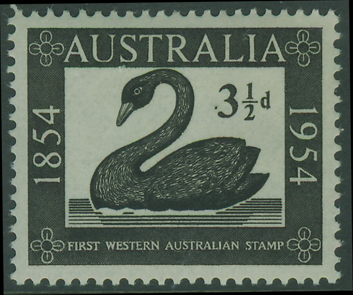 Die ersten Briefmarken Westaustraliens erschienen am 1. August 1854, nämlich die drei Werte zu 1 Penny, 4 Pence und 1 Shilling. Ursprünglich war nur der Wert zu 1 Penny vorgesehen: am 8. Juni 1852 hatte der Gouverneur der Kolonie, Charles Fitzgerald, in London den Druck von einer Million 1 Penny-Marken in Auftrag gegeben, welche das Wahrzeichen der Kolonie, den schwarzen Schwan, auf farbigem Untergrund darstellen sollten. Der farbige Untergrund war zu jener Zeit nicht verwirklichbar, aber eine Million Marken in schwarz wurden gedruckt und am 10. September 1853 nach Westaustralien verschifft, zusammen mit der Druckplatte, einer Druckerpresse, einem Vorrat an Papier mit Wasserzeichen (ebenfalls einem Schwan) und schwarzer Druckertinte.