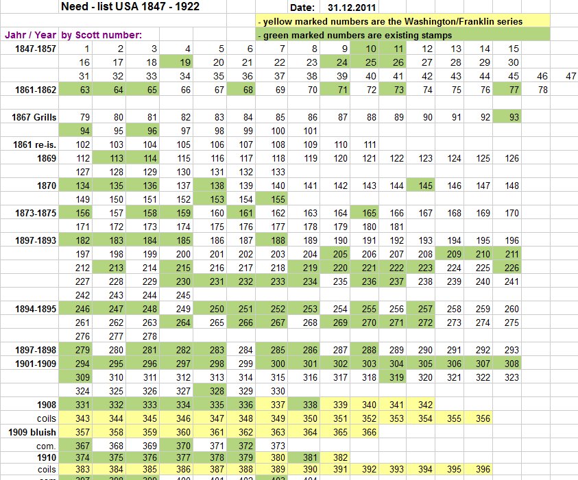 Eine Exceltabelle eignet sich grundsätzlich sehr gut zur Verwaltung seiner Sammlung. Allerdings gibt es kaum eine Standartisierte Vorlage, da jeder Sammler mit seinen eigenen Sammelgebieten anders sammelt. mal sind nur Nummern angegeben mal sind es sehr spezielle Angaben wie Druckvermerke oder Plattenfehler, und und und.