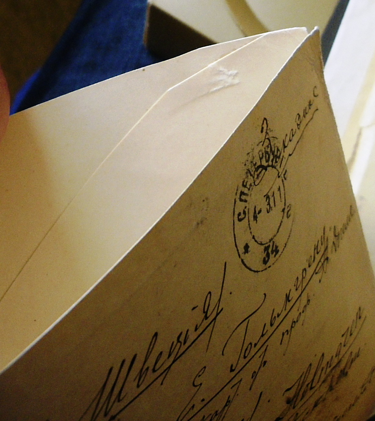 Ich habe meine Bestände an Kuverts durchgesehen, aber leider nur einen gefunden, der Merkmale , die von einer Öffnung stammen können, aber keine Markierung aufweist. Dies ist ein Einschreibebrief von Prof. Alexander Dogel ` an Prof. E. Holmgren am Karoliniska-Institut in Stockholm. Prof. Dogel` hatte auf der Vorderseite unter der Empfängerangabe vermerkt: „Mit Einlage von Photogr[aphien] vom Lehrstuhl …“ Vielleicht hat das die Zensoren auf den Plan gerufen. An der linken Hälfte der Briefklappe sind Spuren von Klebstoff zu sehen, die es auf der rechten Seite nicht gibt. Außerdem ist die linke Seitenklappe innen oben beschädigt, evtl. vom Eindringen mit einem „Brieföffner“.
