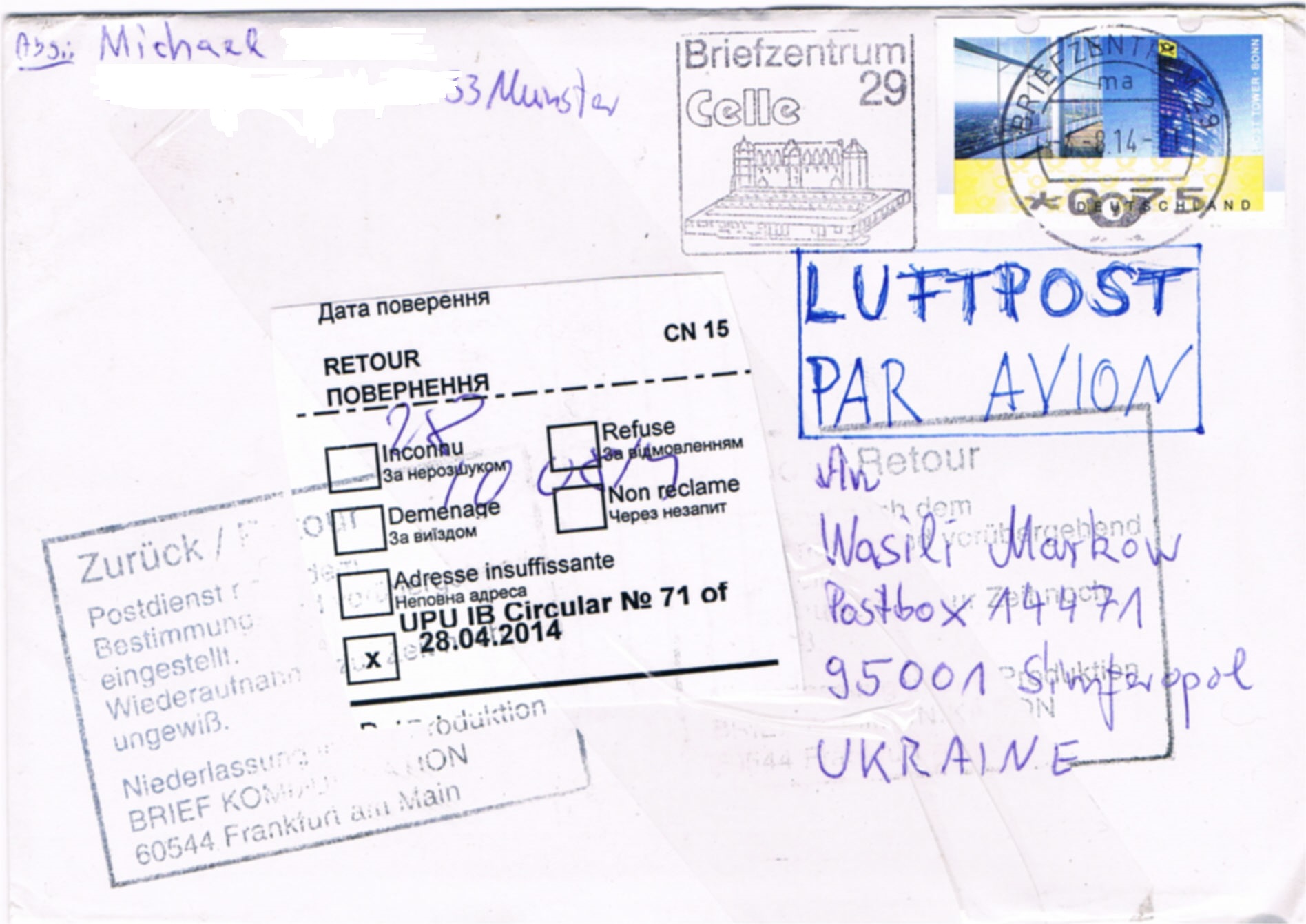 heute ist mein fast vergessener Brief in die Ukraine zurückgekommen. Gestempelt am 04.08., ich könnte fast schwören, dass ich ihn wesentlich früher zur Post gegeben hatte. Der Retouraufkleber "UPU IB Circular No. 71 of 28.04.2014" wurde hier bereits gezeigt.
