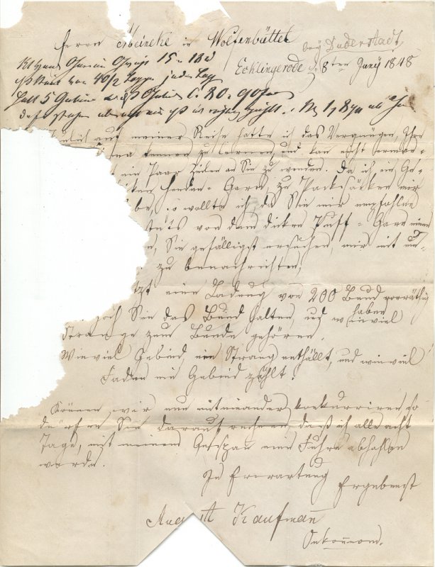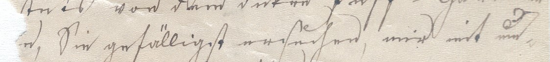 Da der Brief stark durch Mäusefraß beschädigt worden ist, kann ich nicht den ganzen Satz wiedergeben. Es steht dort: ", Sie gefälligst ersuchen, mir mit ..?.."