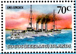 Zum Schiff selbst gibt es alte Ansichtskarten, eine Marke von den Cocos-Inseln sowie Vignetten. Einen Schiffspost-Stempel dazu habe ich nicht gefunden, vielleicht kann den jemand anderes noch zeigen, auch die dreistellige Schiffspost-Nummer des Kreuzers weiß ich nicht, die auf einem solchen Stempel steht.