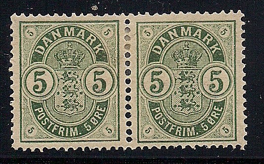 ich springe mal zurück zur 1882er Ausgabe. Damals war ich bei den Typen der 5 Öre Marke die Type T schuldig geblieben. Heute kann ich ein Paar der 5 Öre Marke 1. Druck zeigen, bei der m. E. die rechte Marke den "dicken Hals" bei der rechten großen Wertziffer aufweist. Wenn man die beiden Marken des Paares vergleicht, sollte der "Dickenunterschied" ins Auge fallen.