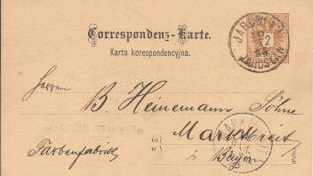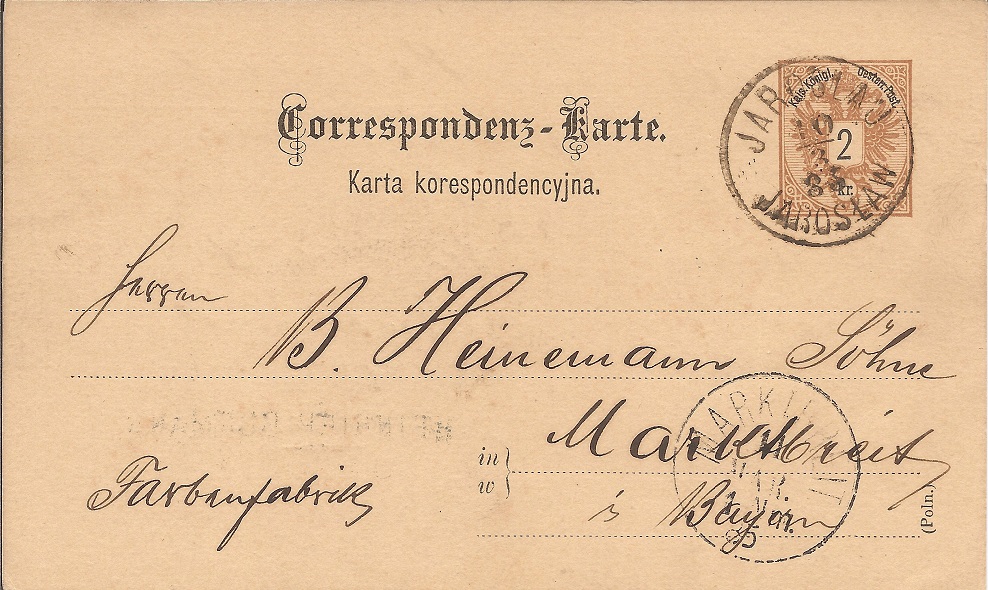 Sauber auf der Ganzsache abgeschlagen ist der Ankunfts-Stempel von Marktbreit (Durchmesser 26mm); Datum 11. MÄR (18)85 (Nach Dr. J. Helbig ist es Stempeltyp 21 b). Die Stempelbewertung des Stempels von JAROSLAU liegt mir nicht vor.