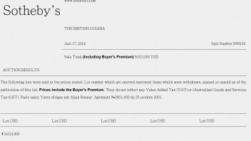Die Versteigerung der einzig noch existierenden Britisch-Guiana-Marke erbrachte das Rekord-Ergebnis von 9,5 Mio. USD (= ca. 7,125 Mio. EUR), also knapp unterhalb der vorher geschätzten Preisspanne von 10 - 20 Mio. USD.