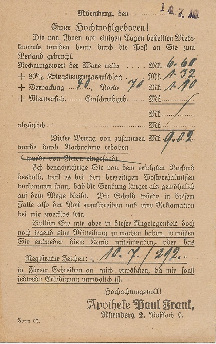 2. Februar 2022 um 08:36 #41 Medikamente online - alter Hut oder kalter Kaffee!Die Rückseite einer bayerischen P98I/03 aus Nürnberg ist über 100 Jahre alt!Und gegen Versandversäumnisse seitens der Post hat man sich damals schon abgesichert.