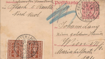 Die Karte ist portorichtig am Letzttag (!) der 11. Infla-Portoperiode (1.8.1923 - 30.11.1923) gelaufen; Porto für Postkarte 300 Kronen. Die für die 10. Portoperiode vorgesehene Karte (Postkartenporto 200 K.) weist daher die Zusatzfrankatur von 100 K. auf, abgedeckt mit 2 x 50 K. - "Landschaft, Gewerbe, Industrie" MiNr. 374; braunorange) Interessant ist in diesem Zusammenhang der wieder gestrichene Taxvermerk: Die beiden aufgeklebten Marken waren speziell als Zusatzfrankatur auf Ganzsachen länger frankaturgültig und zwar bis zum 31. Dezember 1923. Dieser Sonderregelung wurde offenbar anfänglich keine Beachtung geschenkt, und erst nach dem Bemerken des Irrtums wurde das „T“ mit Blaustift wieder gestrichen.