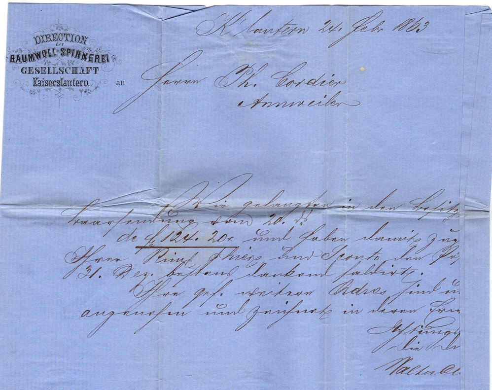 Brief von de rBaumwollspinnerei Gesellschaft Kaiserslautern nach Annweilervom 24 Februar 1863.