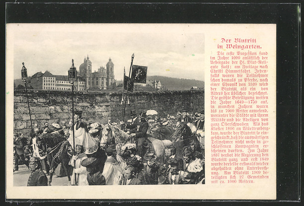 wandervogelgelb hatte den richtigen Riecher. Die Karte zeigt den Blutritt in Weingarten. Ich hatte wegen der Pickelhauben erst auf das Rheinland getippt. Aber auf alten Ansichten des Blutritts laufen die "bepickelten" Gendarmen auch rum. Auf einer Karte ist sogar die Löwenstandarte zu sehen.