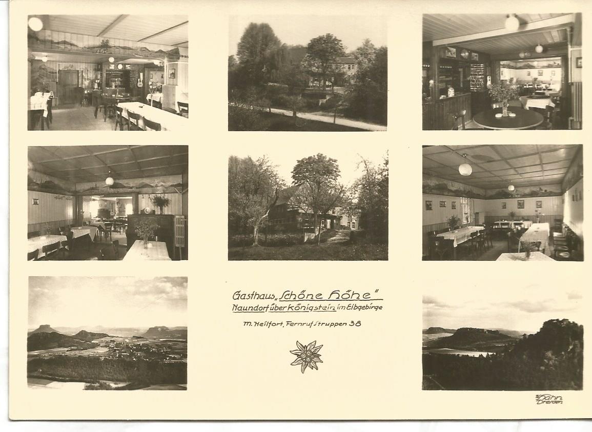 Poststelle II Stempel "Naundorf über Pirna" auf Paketkartenabschnitt (ohne Datum) auf Pärchen Mi. 418 (Dresdener Zwinger, Serie Fünfjahrplan II). Dazu eine Mehrbild-Ansichtskarte des Dorfes.