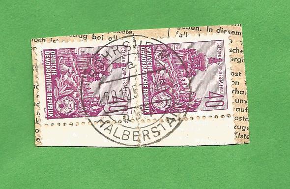 Poststelle I Stempel ROHRSHEIM a über HALBERSTADT vom28.12.1957 auf senkrechtem Eckrandpärchen Mi. 456 auf Paketkartenabschnitt.