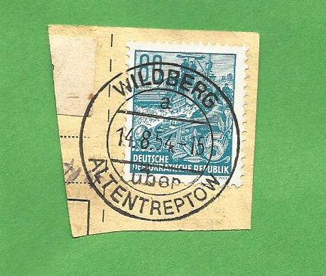 Poststelle I Stempel WILDBERG a über ALTENTREPTOW vom 14.8.1954 und vom 2.8.1954 auf Paketkartenabschnitten.
