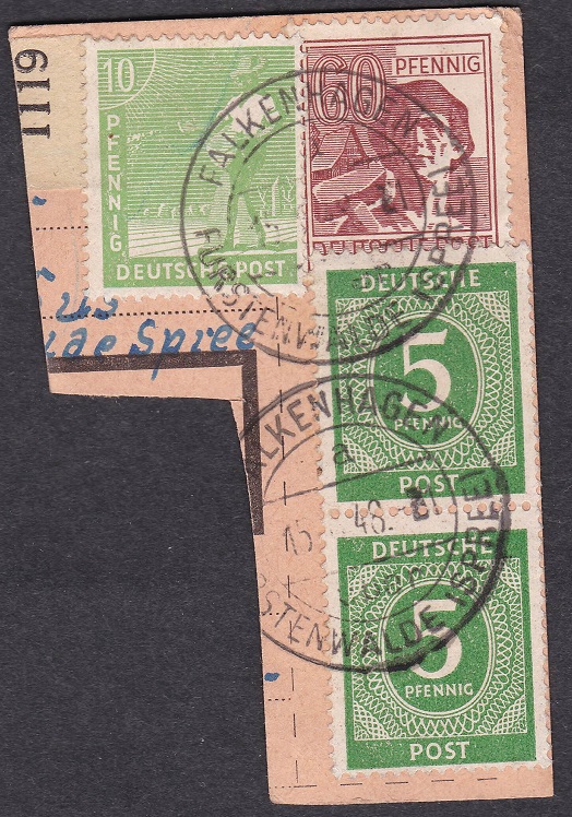 Und gleich noch ein Poststellenstempel aus Falkenhagen über Fürstenwalde (Spree) vom 15.6(?).1948 hinterher.