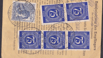 Und ein weiteres Exemplar von Prohn über Stralsund vom (6.6.1948?). Abgebildet sind zwei Seiten eines Paketkartenabschnittes.