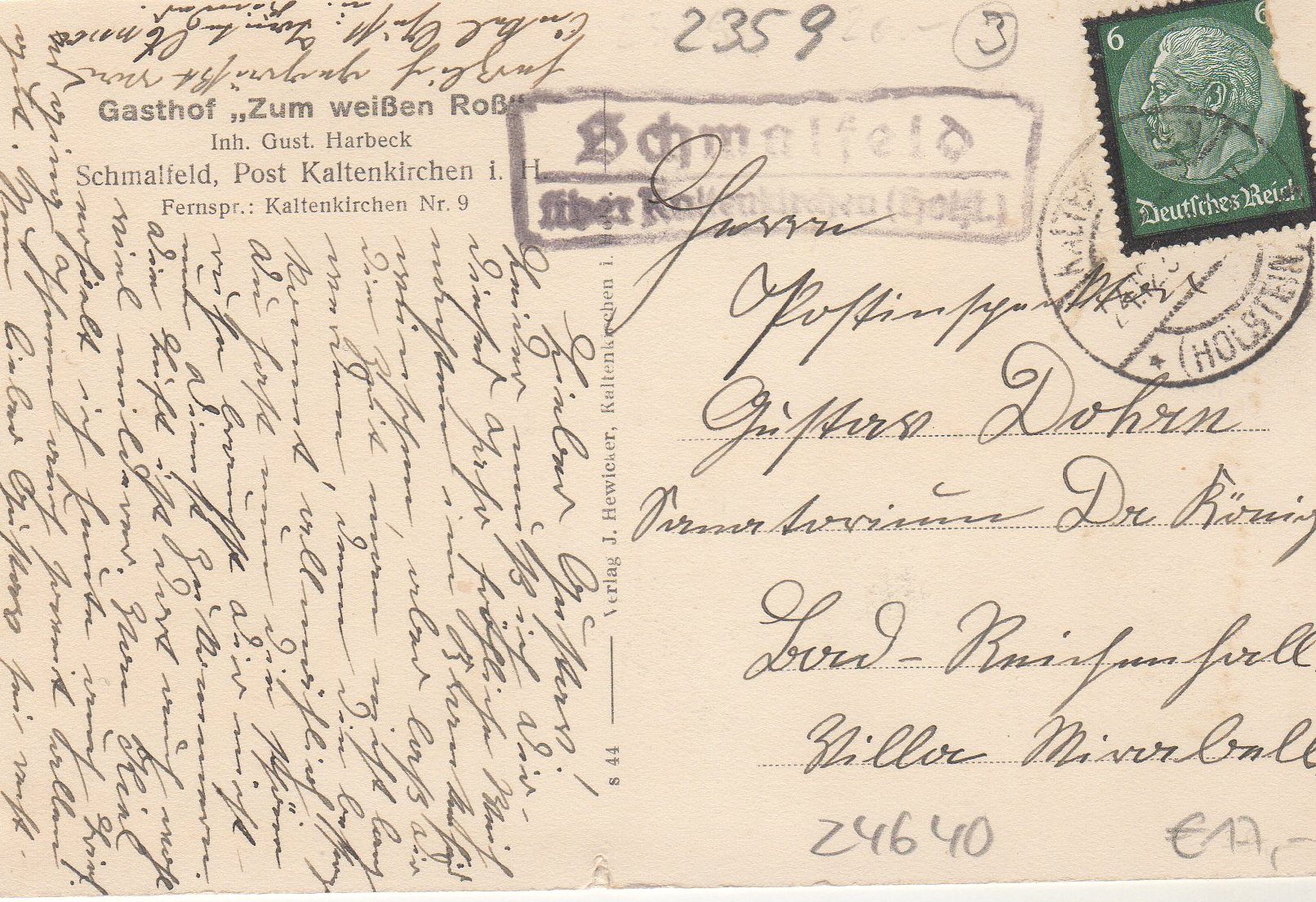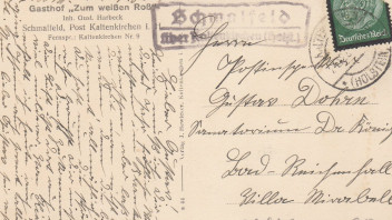 Hier nun zwei Beispiele mit dem Zweikreisstegstempel Elmshorn l aus den Jahren 1938 und 1939. Die Schlaufe des l erscheint mir hier aber schlanker als bei dem Poststelle II Beleg. Da ich aber keinen einzigen Elmshorn c Zweikreissteg-Stempel gefunden habe ist es wohl doch der l-Stempel.