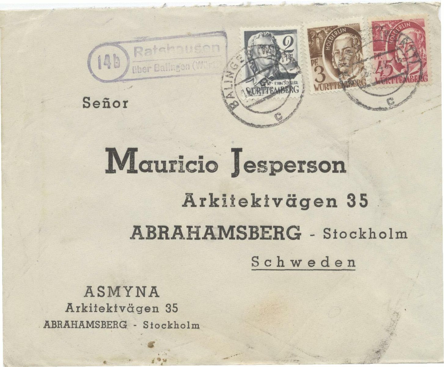 Ist das nicht derselbe wie letzten Donnerstag ? Die Adresse war mir aufgefallen. Man findet aus der Nachkriegszeit öfter Belege mit dieser vorgedruckten Adresse. Mauricio Jesperson kann man googlen. Auch auf den Philaseiten wurden diese Belege schon mal behandelt.