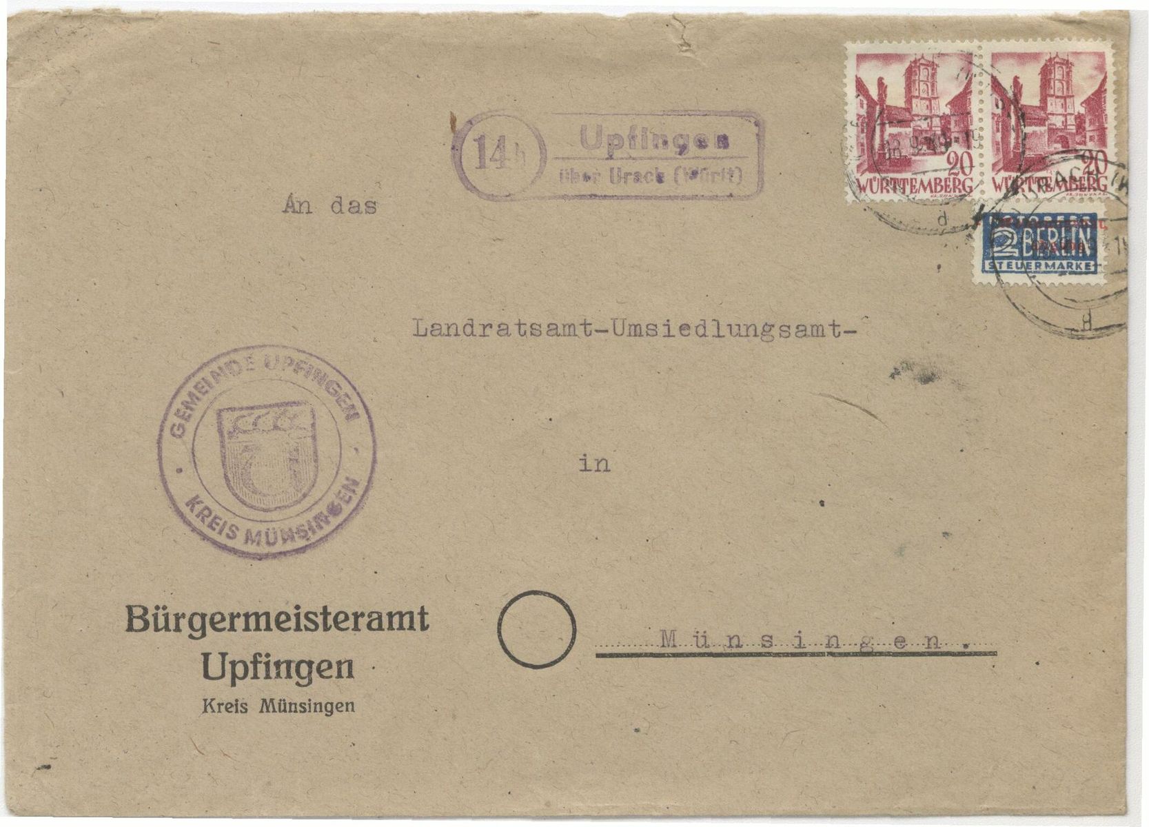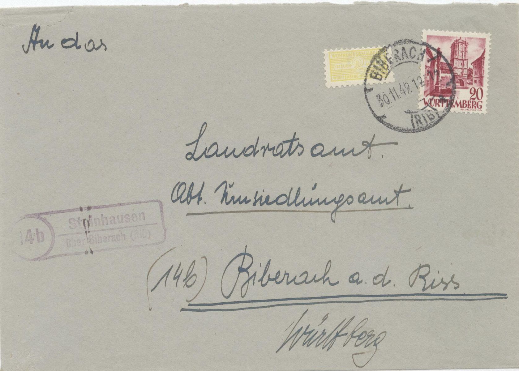 Ich zeige einen Brief aus Rundhof an den Minister für Wiederaufbau in Düsseldorf aus dem Jahr 1954. Der Halbspatelstempel "(24b) Rundhof /über Kappeln (Schlei)" ist wie üblich links von der Frankatur abgeschlagen. Die 20 Pfg. Heuss und die 2 Pfg. Notopfer-Marke sind mit dem Zweikreisstegstempel "(24b) Kappeln (Schlei) d 27.10.54 -13" entwertet. Leider ist der Stempel etwas verschmiert.
