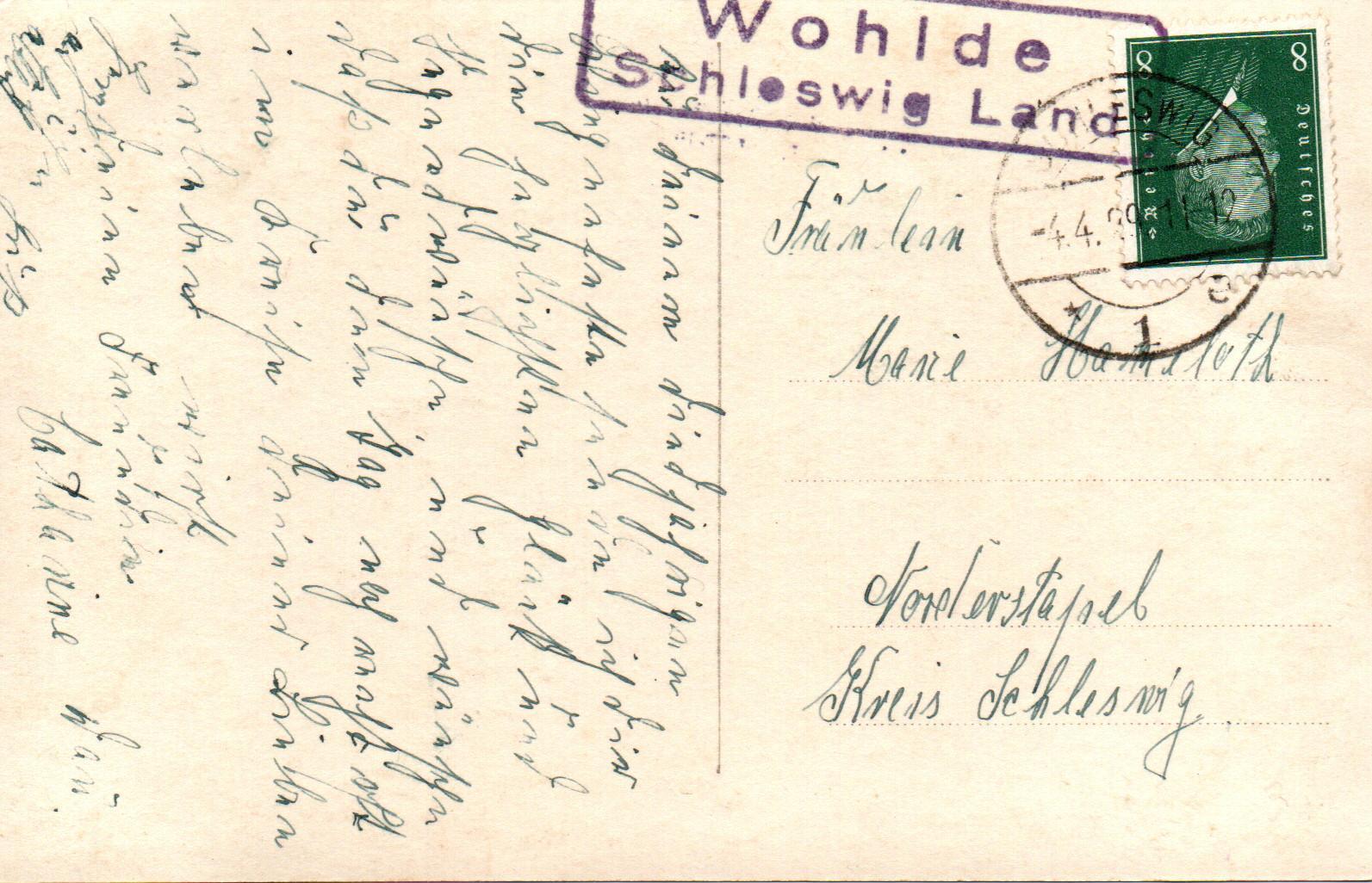 Meine Postkarte aus dem Jahr 1929 lief von Wohlde nach Norderstapel. Links von der Frankatur ist der Ra2-Stempel "Wohlde / Schleswig Land" abgeschlagen. Die 6 Pfg Ebert-Marke wurde im Leitpostamt mit dem Stegstempel "Schleswig 1 e 4.4.29 11-12" entwertet.