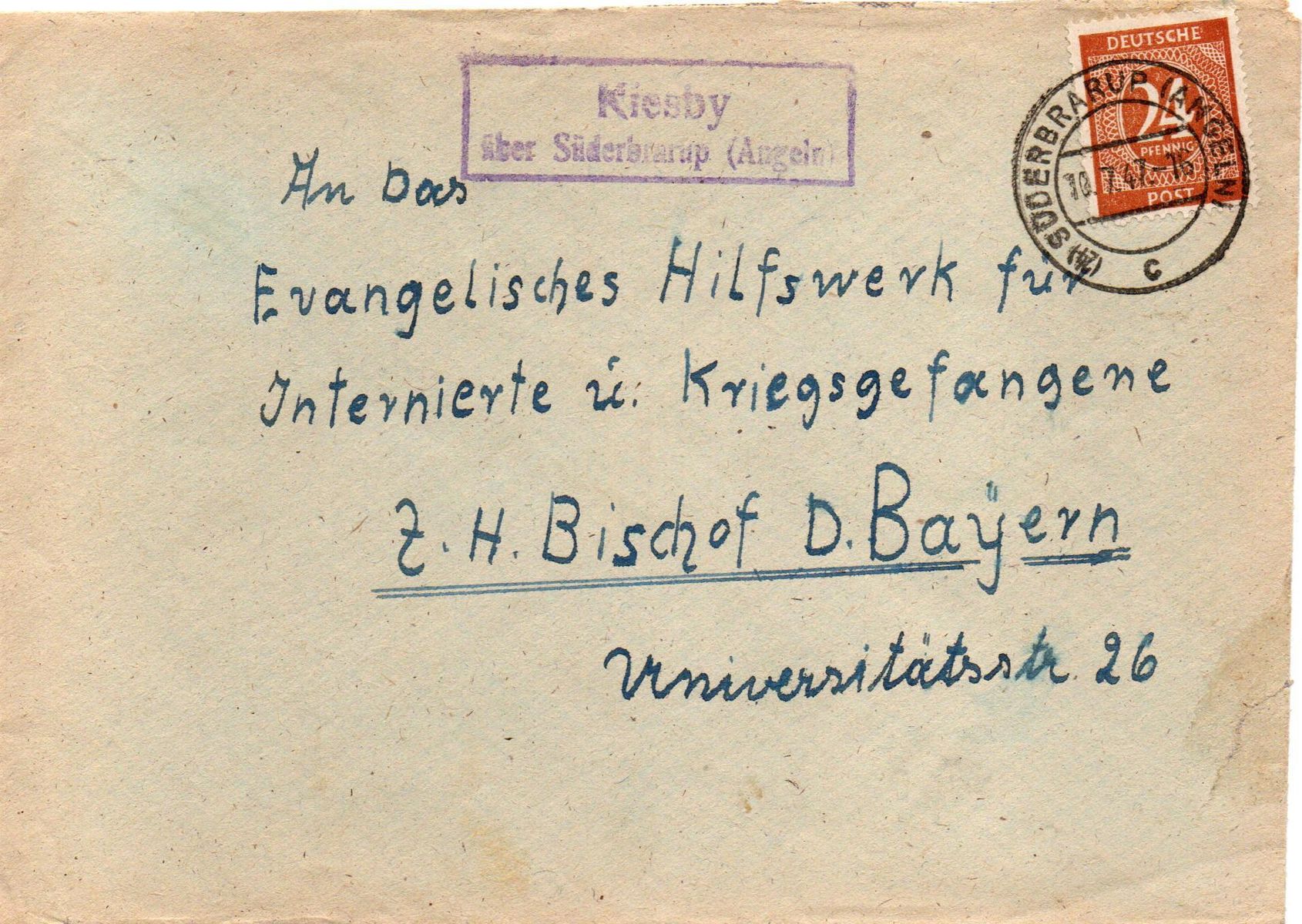 Der Brief wurde im benachbarten Kiesby (beide Dörfer gehören heute zur Gemeinde Boren) bei der dortigen Poststelle aufgegeben.Der Ra2-Poststellenstempel "Kiesby / über Süderbrarup (Angeln)" wurde links von der Frankatur abgeschlagen. die 24 Pfg-Marke der Kontrollrats-Ziffernausgabe wurde im Leitpostamt mit dem Zweikreisstegstempel "(24) Süderbrarup (Angeln) c 10.7.47 -16" entwertet. Der Stempel ist nicht symmetrisch, ein Hinweis darauf, dass die (24) nachträglich eingefügt wurde.