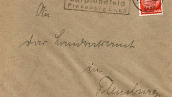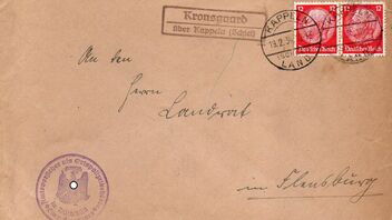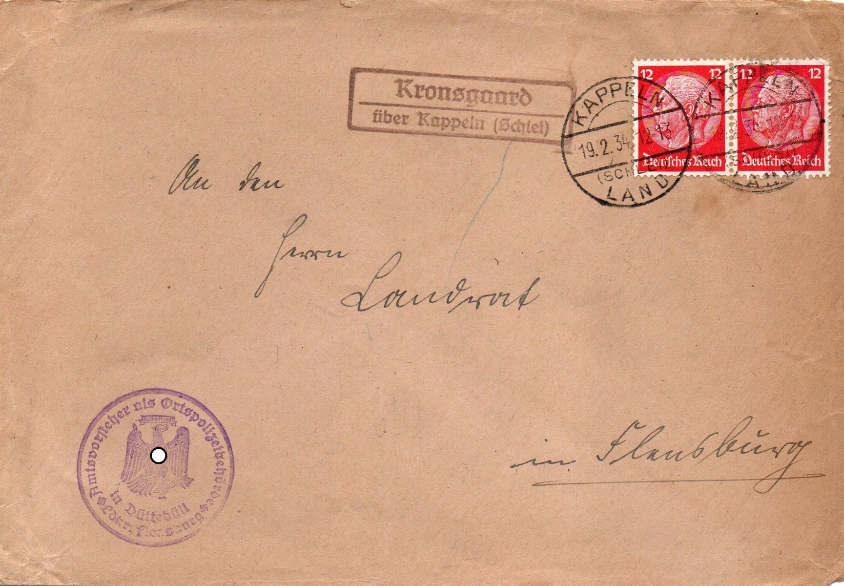 Hier nun ein Brief des Amtsvorstehers von Düttbüll an das Landratsamt in Flensburg aus dem Jahr 1934. Der Brief wurde in der südlich von Düttbüll gelegenen Poststelle II in Kronsgaard aufgegeben. Die beiden 12 Pfg. Hindenburg-Marken wurden im Leitpostamt mit dem Stegstempel "Kappeln (Schlei) Land 19.2.34 12-13" entwertet.