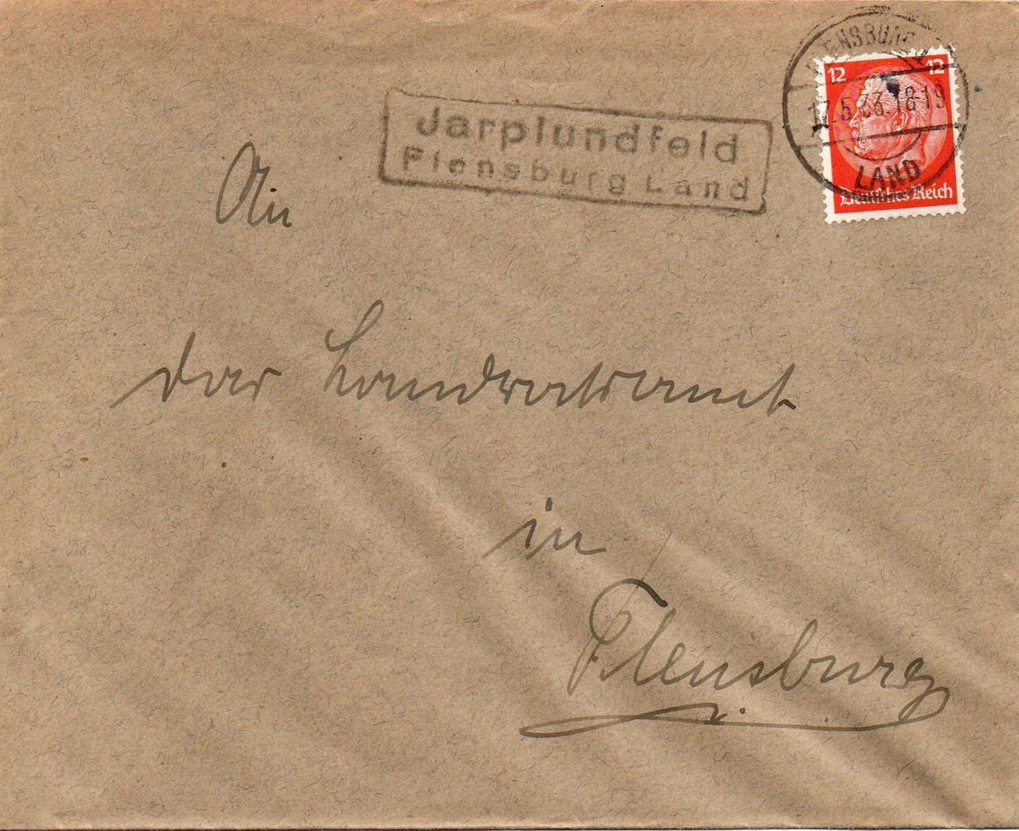 Mein Brief war an das Landratsamt gerichtet und wurde bei der Poststelle II Jarplundfeld aufgegeben. Der Ra2-Poststellenstempel "Jarplundfeld / Flensburg Land" wie üblich links von der Frankatur abgeschlagen, die 12 Pfg. Hindenburg-Marke mit dem Stegstempel "Flensburg Land 17.5.333. 18-19" entwertet. IN dem von mir beackerten Gebiet ist eine Verwendung eines "xx / yy Land" Stempels im Jahr 1933 schon ungewöhnlich. Die meisten Poststellen hatten diese "Urstempel" bereits durch "xx / über yy" Stempel, meist mit Frakturschrift, ersetzt.