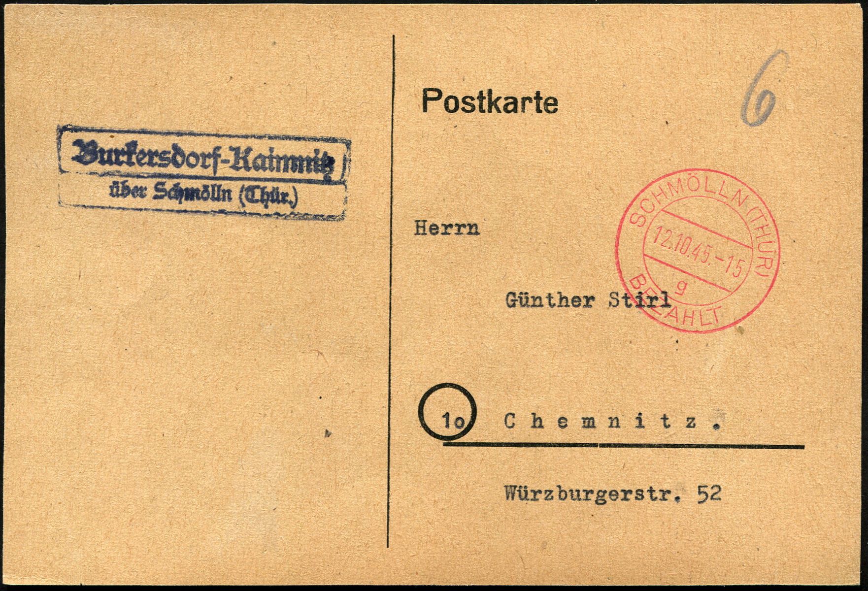 Fernpostkarte nach Chemnitz, die in der Poststelle II "Burkersdorf-Kaimnitz über Schmölln (Thür.)" aufgegeben wurde. Die Freimachung der Karte erfolgte mit einem Gebühr bezahlt - Vermerk der Type C 1 h (Tagesstempel in Form eines Zweikreisstegstempels mit integriertem Freivermerk) im zuständigen Leitpostamt Schmölln (Thür) am 12.10.1945.