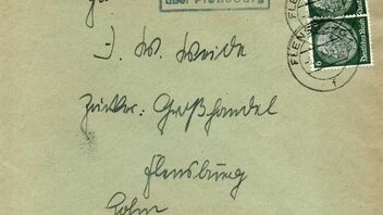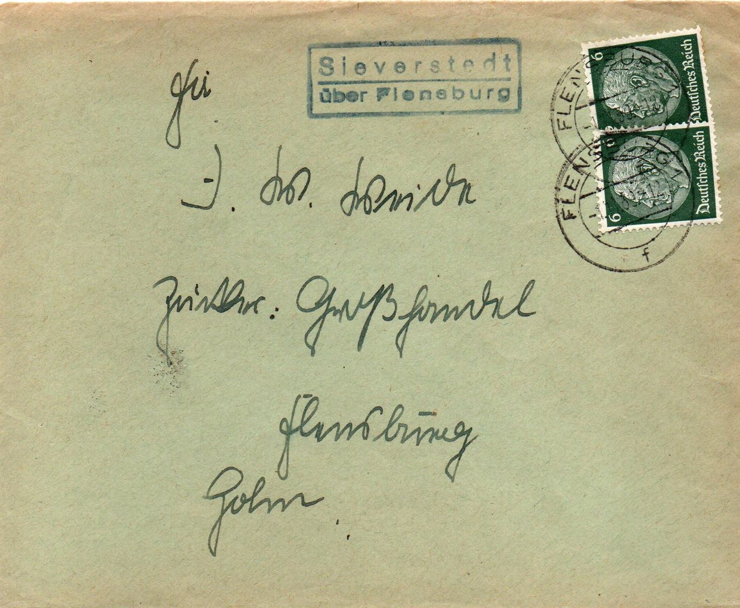 Mein Brief ist in Sieverstedt geschrieben und bei der örtlichen Poststelle aufgegeben worden. Wie üblich wurde der Ra2-Stempel "Sieverstedt / über Flensburg" links neben der Frankatur abgeschlagen. Die beiden 6 Pfg. Hindenburg-Marken wurden im Leitpostamt mit dem Zweikreisstegstempel "Flensburg 1f 1.11.39 -12" entwertet.