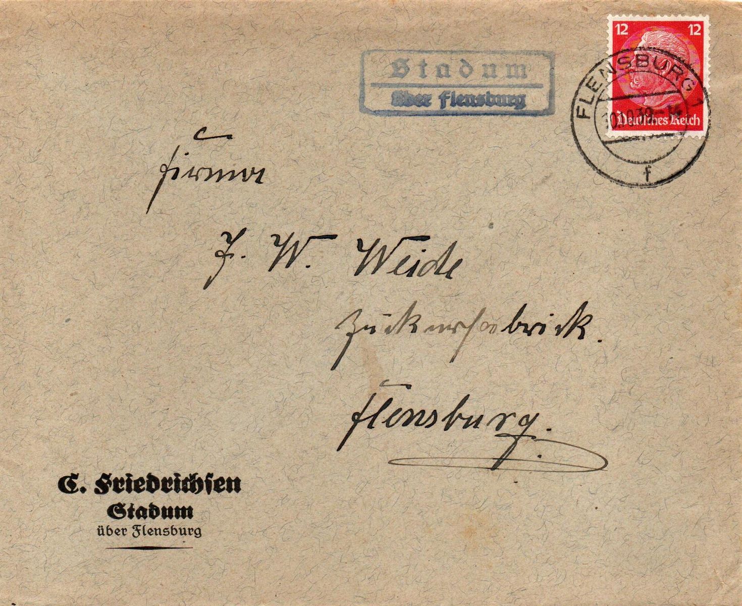 Mein Brief aus Stadum wurde bei der örtlichen Poststelle aufgegeben und war an die Zuckerfabrik Weide in Flensburg adressiert. Eine Zuckerhandlung Weide existiert noch heute in Flensburg. Der Ra2-Poststellenstempel (Frakturschrift) "Stadum / über Flensburg" war links von der Frankatur abgeschlagen, die 12 Pfg. Hindenbung-Marke wurde im Leitpostamt mit dem Zweikreisstegstempel "Flensburg 1f 10.10.39 -14" entwertet.