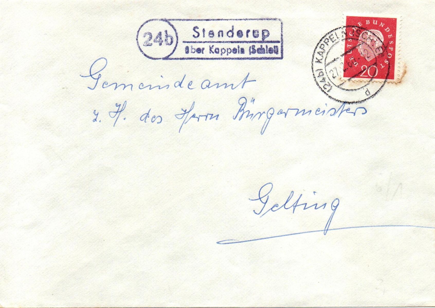 Hier ein Brief aus der Nachkriegszeit, 1960 in Bobeck geschrieben und in Stenderup aufgegeben. dressiert ist der Brief an den Bürgermeister von Gelting. Der Halbspatelstempel "(24b) Stenderup / über Kappeln (Schlei)" ist wie üblich links neben der Frankatur abgeschlagen, die 20 Pfg. Heuss-Marke wurde im Leitpostamt mit dem Zweikreisstegstempel "(24b) Kappeln (Schlei) d 27.2.60 - 12" entwertet.