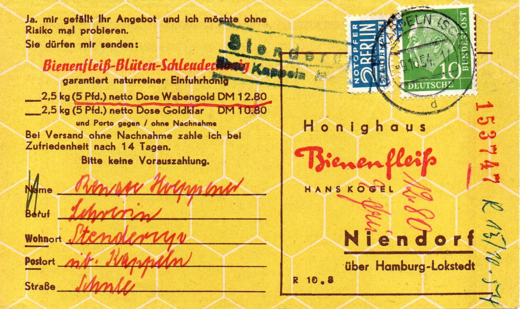 Von mir nochmals eine Bienefleiss-Bestellkarte.diesmal wieder aus Stenderup über Kappeln. Von dieser Poststelle hatte ich ja schon bei früherer Gelegenheit Belege gezeigt. Dieses Mal ein Ra2-Stempel "Stenderup / über Kappeln (Schlei)" aus dem Jahr 1954. Die 10 Pfg. Heuss und die 2 Pfg. Notopfermarke wurden im Leitpostamt mit dem Zweikreisstegstempel "(24b Kappeln (Schlei) d 9.10.54 -17" entwertet.