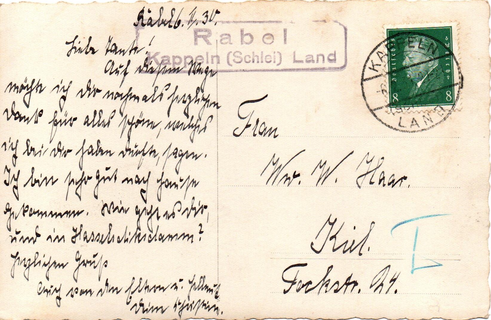 Die Karte wurde am 6.2.30 (Schreibfehler?) in Rabel geschrieben und war nach Kiel adressiert. Der Ra2-Stempel "Rabel / Kappeln (Schlei) Land" war wie üblich links neben der Frankatur abgeschlagen. Die 8 Pfg. Ebert-Marke wurde im Leitpostamt mit dem Stegstempel " Kappeln (Schlei) Land 6.2.31(!) 20-2" entwertet.