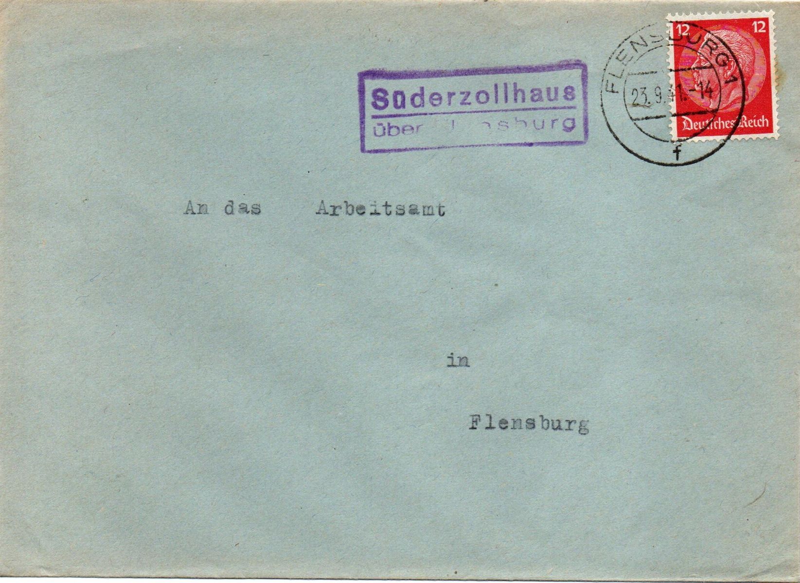 Der an das Arbeitsamt in Flensburg gerichtete Brief trägt keine Absenderangaben und wurde bie der Poststelle Ii in Süderzollhaus aufgegeben. Der Ra2-Stempel "Süderzollhaus / über Flensburg wurde links von der Frankatur abgeschlagen, die 12 Pfg. Hindenburg-Marke wurde im Leitpostamt mit dem Zweikreisstegstempel "Flensburg 1f 23.9.41 -14" entwertet.