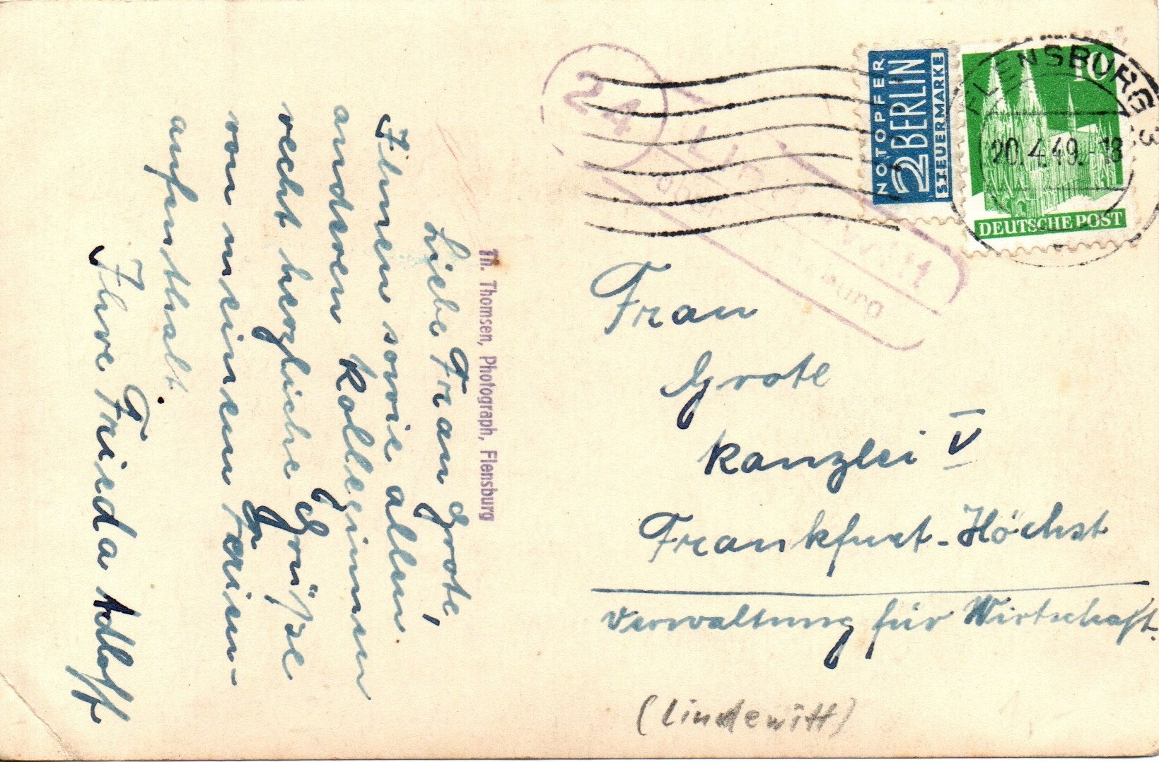 wieder einmal ein Beleg der Poststelle II in Lindewitt. Diesmal eine Ansichtskarte mit dem Halbspatelstempel "(24) Lindewitt / über Flensburg" Die 10 Pfg. Bauten-Marke und die Notopfermarke wurden mit Maschinenstempel "Flensburg 3 ? 20.4.49. -18" entwertet. Der unleserliche Unterscheidungsbuchstabe ist vermutlich ein "b" Zumindest weisen die anderen zeitgenössischen Maschinenstempel des Postamts Flensburg 3 diesen Unterscheidungsbuchstaben auf.
