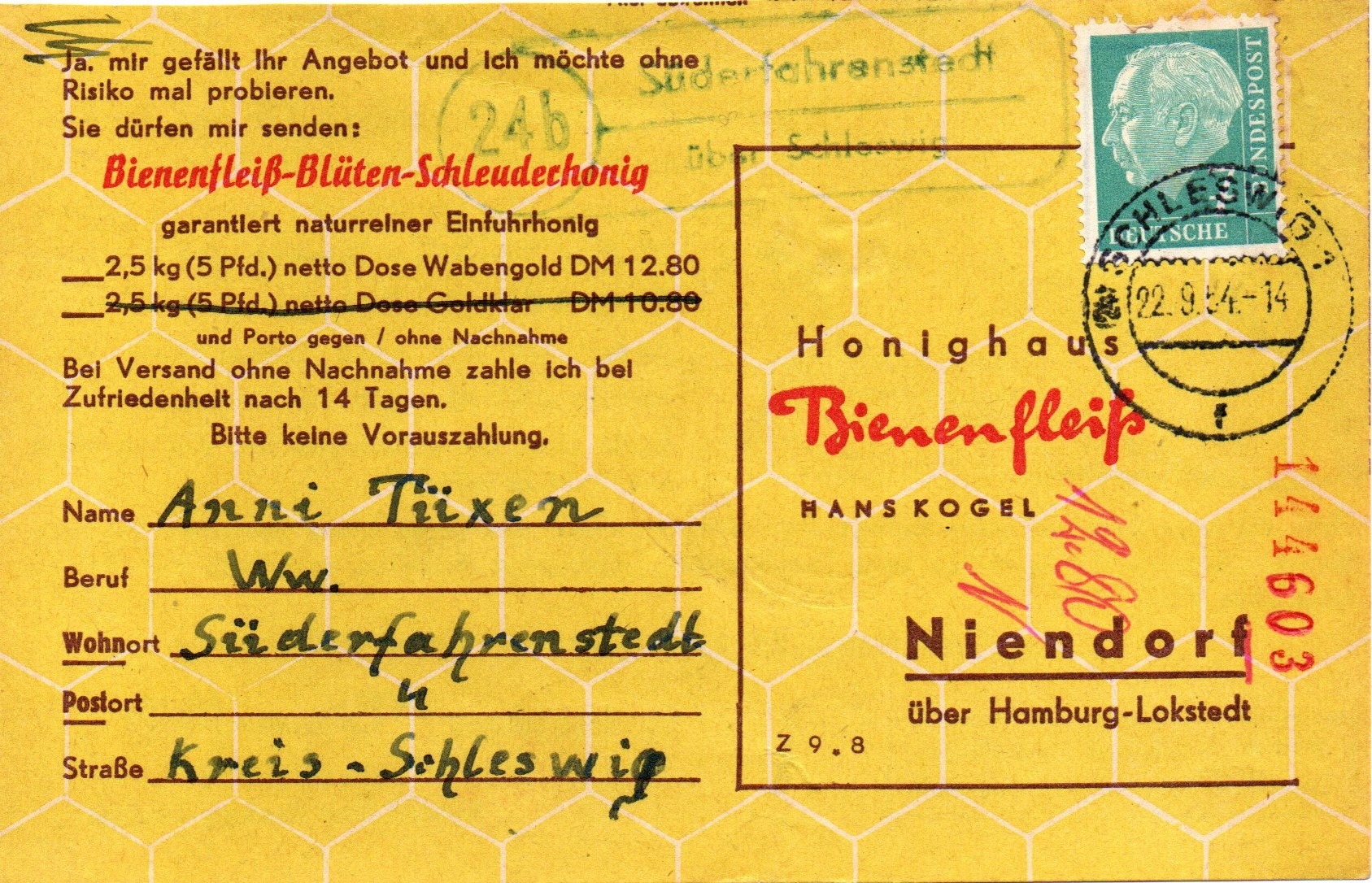 Wieder mal eine Bienenfleiss-Bestellkarte, Halbspatelstempel "(24b) Brunsholm / über Kappeln (Schlei)" die 7 Pfg. Heuss-Marke wurde im leitpostamt mit dem Zweikreisstegstempel "(24b) Kappeln (Schlei) d 26.11.58 -16" entwertet. Es handelt sich um ein neues LD.