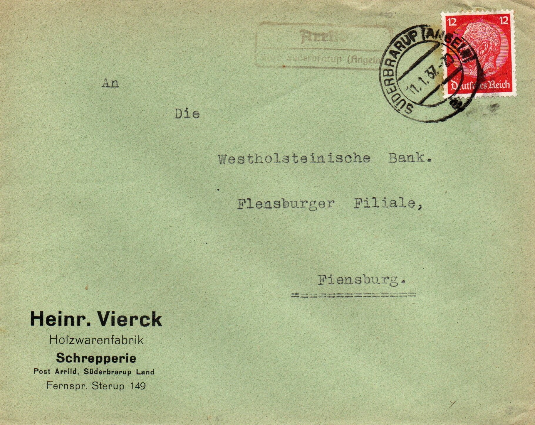 Ich kann jetzt alle drei Stempeltypen vorweisen, die bis 1944 im Handbuch genannt werden. Hier ein Brief aus Arrild nach Flensburg aus dem Jahr 1937. Ra2-Stempel "Arrild / über Süderbrarup (Angeln)" (Fraktruschrift). Die 12 Pfg. Hindenburg-Marke wurde im Leitpostamt mit dem Zweikreisstegstempel "Süderbrarup (Angeln) a 11.1.37 -20" entwertet.