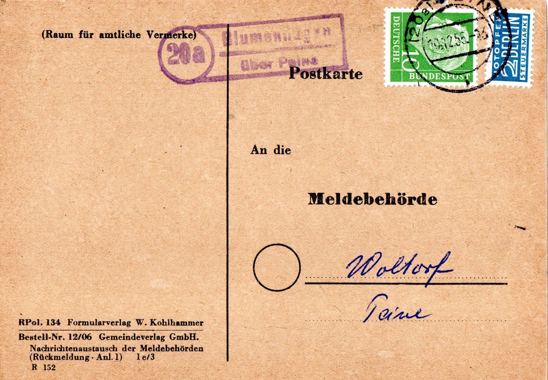 Ra2-Stempel "Koldenbüttel / Friedrichstadt (Eider) Land". In einer wilden Mischung aus Grotesk- und Frakturschrift gesetzt. Von der Inschrift ähnelt der Stempel der Urform aus der Zeit der Einführung der Landpostverkraftung Ende der 1920er Jahre. Hier aber aus der frühen Nachkriegszeit. Sehr ungewöhnlich, ich muss mir wohl das Poststellenstempel-Handbuch nochmals ausleihen.