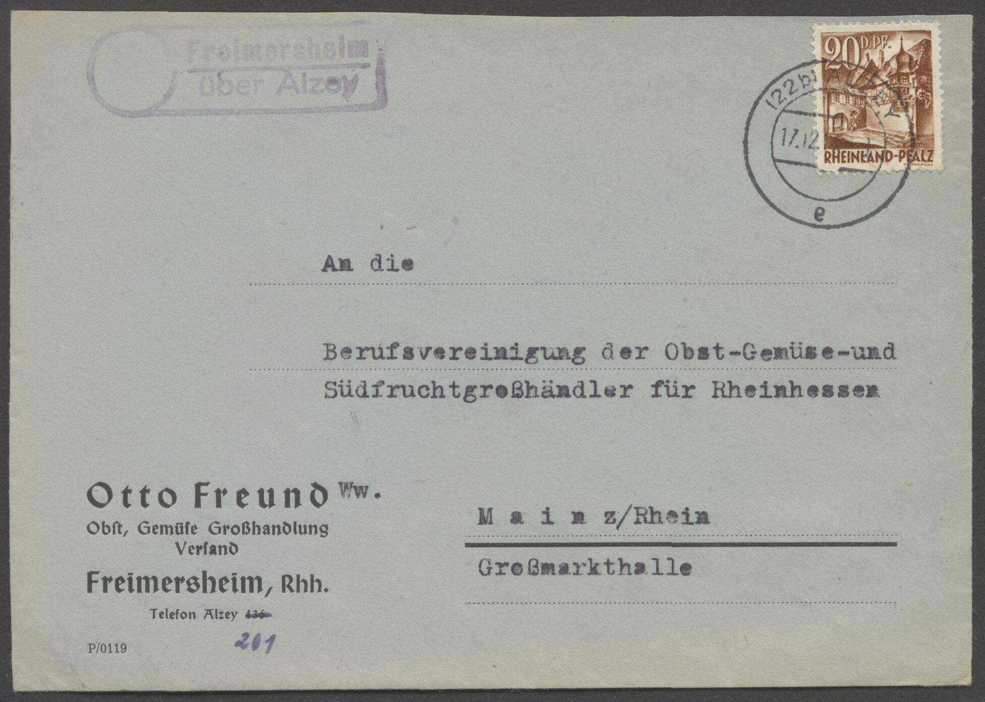 Die 10 Pfg. Bautenmarke und die 2 Pfg. Notopfermarke wurden im Leitpostamt mit dem Zweikreisstegstempel "Fürstenfeldbruck a 6.4.49 -12" entwertet. Bei der 2 Pfg. Notopfermarke handelt es sich m eine ultraseltene Handrupfung des Postmeisters