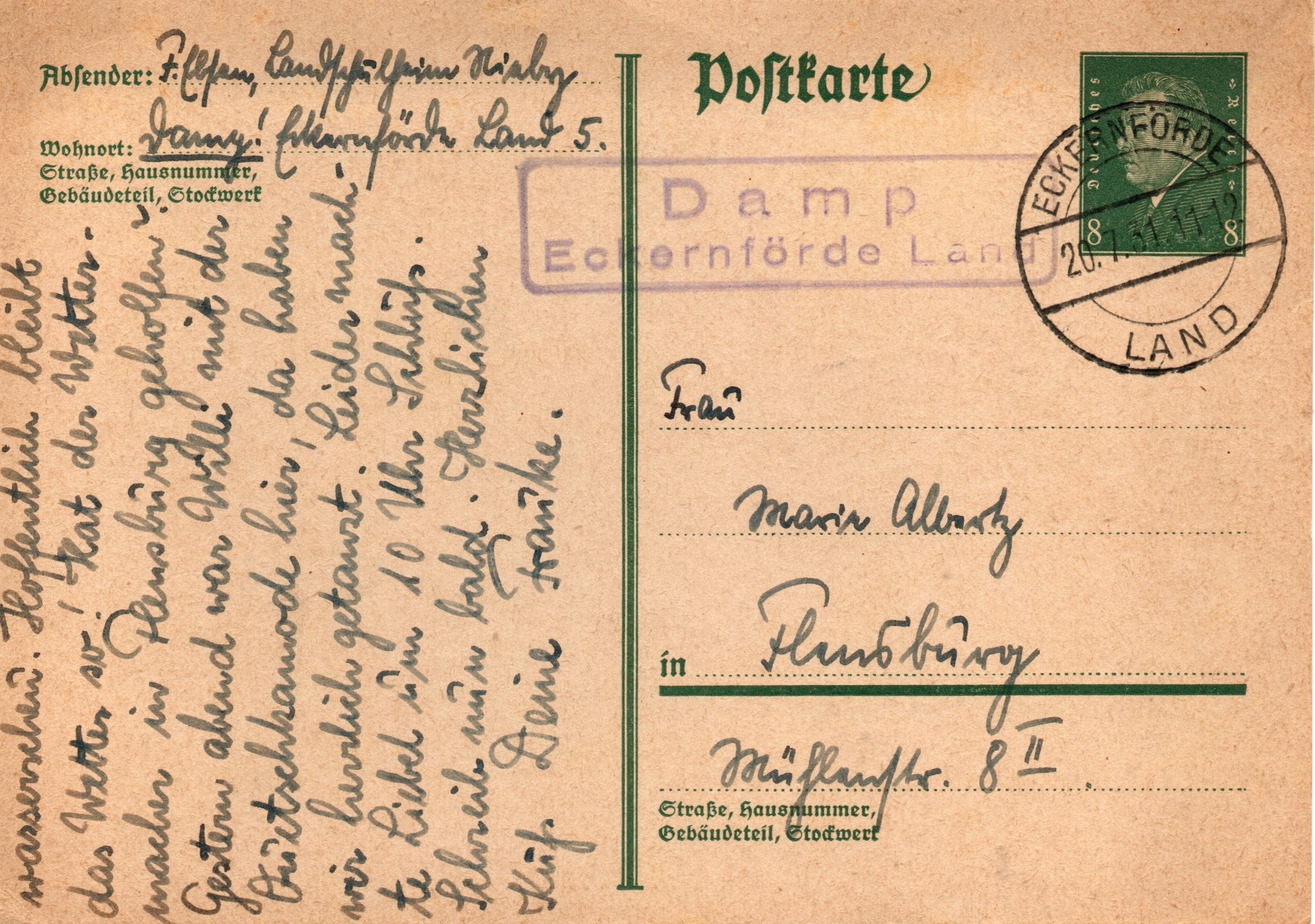 Es handelt sich übrigens um ein neues Frühdatum dieses Stempels. Die Poststelle II Bistensee wurde am 01.10.1929 eingerichtet und bestand bis zum 31.10.1987. Leitpostamt war immer Eckernförde.