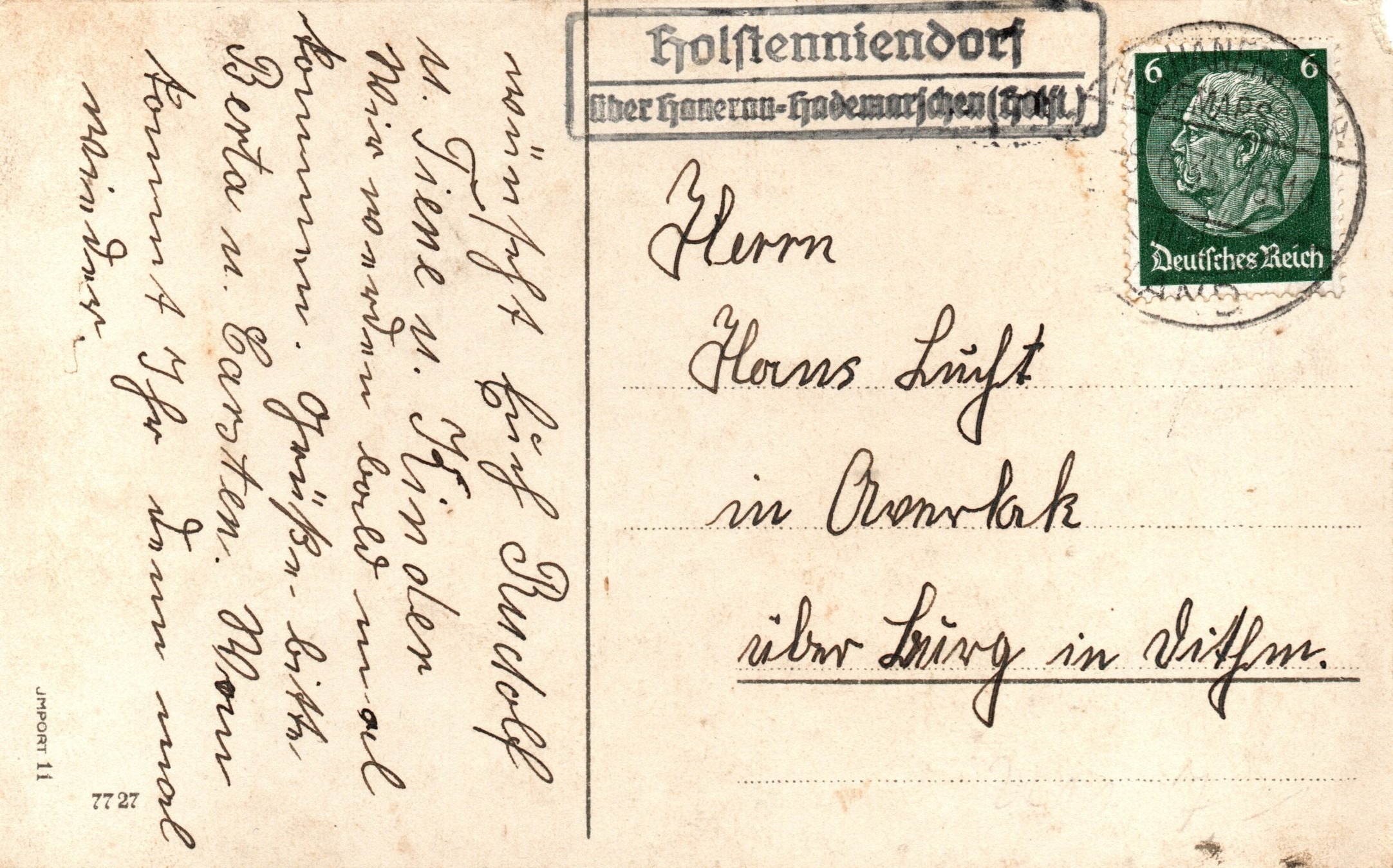 gestern hatte ich im Ansichtskartenthread die Bildseite gezeigt, heute nun die Adressseite mit Landpoststempel. Die Postkarte lief im Jahr 1930 von Bistensee nach Altona-Ottensen.